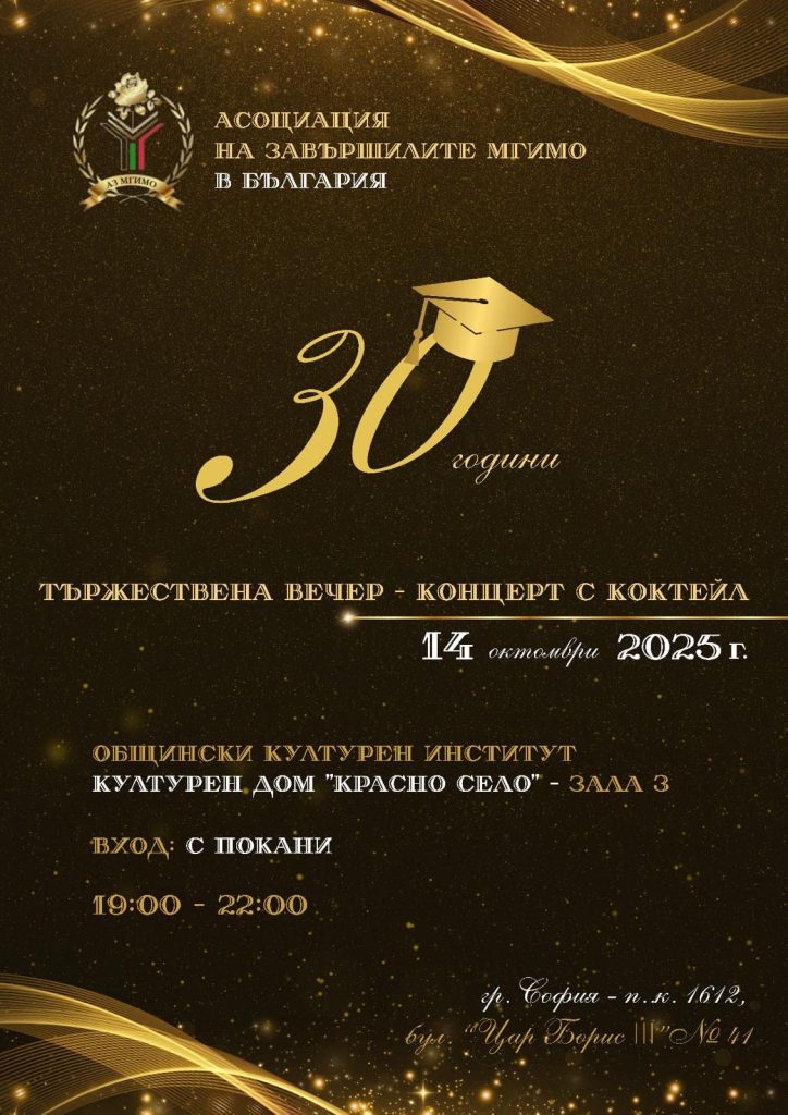 Тридесет години е възраст, достойна за уважение за една организация. До колкото е успешна дейността на дадена структура, бизнес или с нестопанска цел, зависи от хората, които й дават живот, развиват я и я движат напред. Обстоятелството, че нашата Асоциация съществува вече 30 години, че премина през не леки периоди, свидетелства за това, че по-голямата част от випускниците на МГИМО пазят топли чувства към своите колеги и приятели и незабравим спомени от годините на обучението ни в МГИМО, както и от годините след това, по време на професионалната си реализация, което ги мотивира да дават своя принос към живота и дейността на асоциацията.